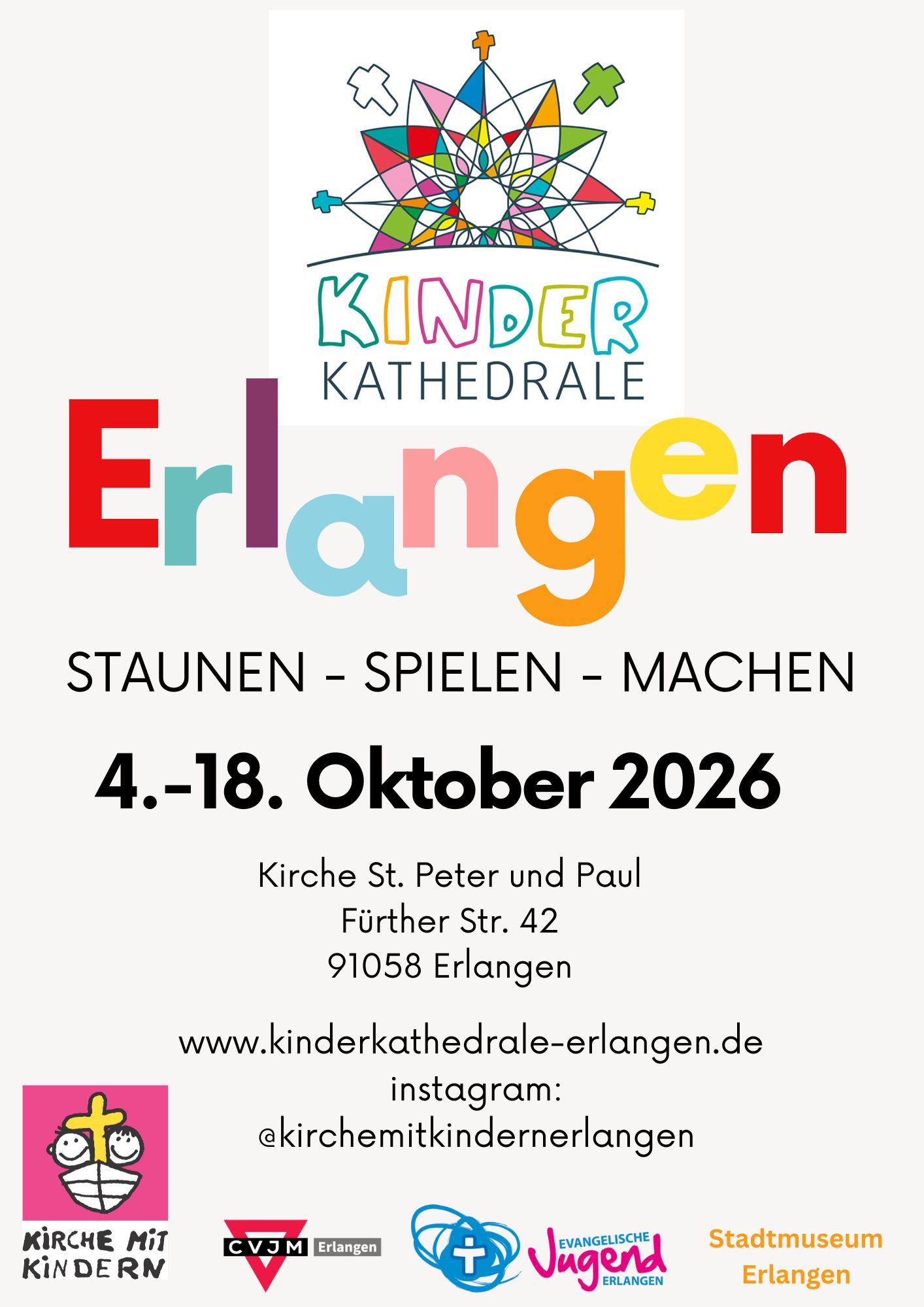 Die evangelische Kirchengemeinde St. Peter und Paul in Erlangen-Bruck richtet im Herbst 2026 gemeinsam mit Partnern zwei Wochen lang eine Kinderkathedrale aus. Vormittags besuchen Kita- und Schulgruppen die Mitmachstationen, nachmittags und an Wochenenden sind Familien, Hortgruppen und Interessierte eingeladen, an Erzählzeiten, Gottesdiensten und Mitmachkonzerten teilzunehmen.